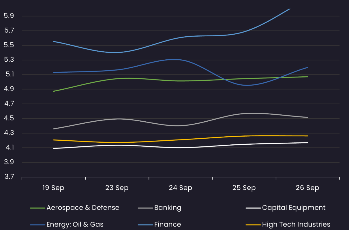Displays the average IG Corp 5 year yield by industry between 9/19/25 – 9/26/25