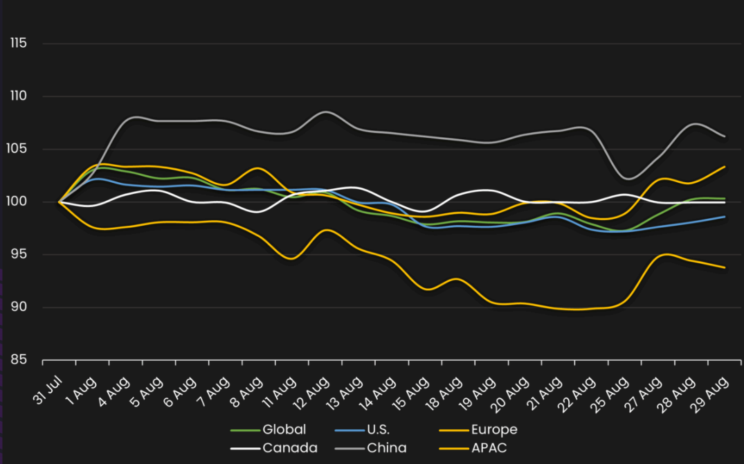 Displays the IG CDS spread by region between 8/1/25 – 8/31/25