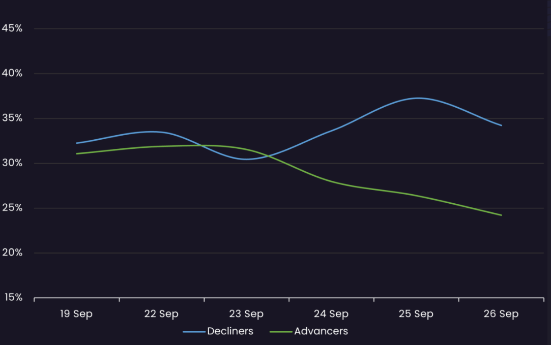 Reveals the percent of loans increasing in price (advancers) vs. loans decreasing in price (decliners) between 9/19/25-9/26/25.