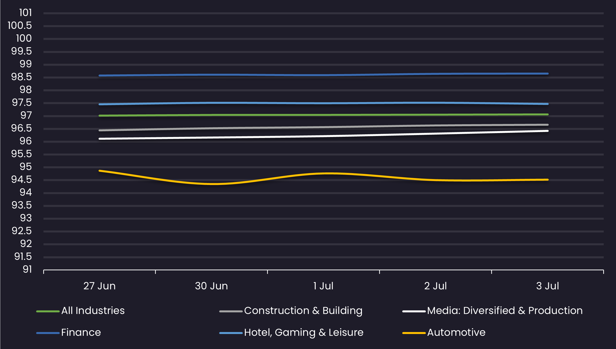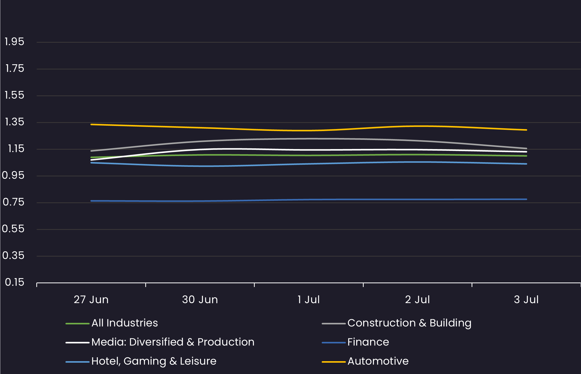 Displays the average loan bid price by sector between 6/27/25-7/3/25 Results are based on 5 select industry sectors, however, we offer data across 36 sectors