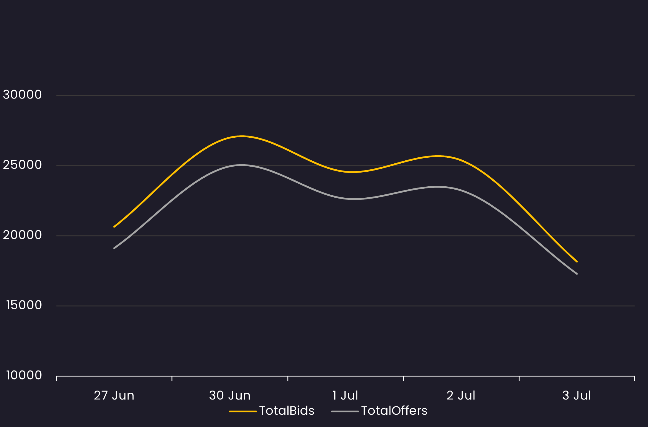 Reveals the total number of quotes by bid and offer between 6/27/25-7/3/25