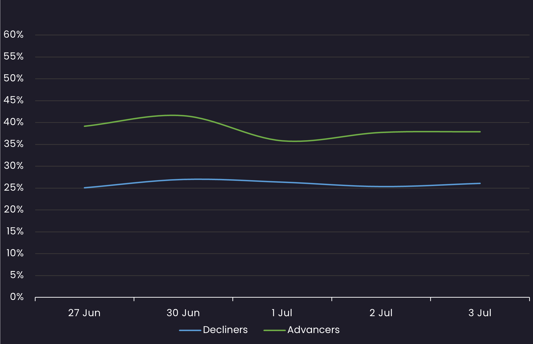 Reveals the percent of loans increasing in price (advancers) vs. loans decreasing in price (decliners) between 6/27/25-7/3/25