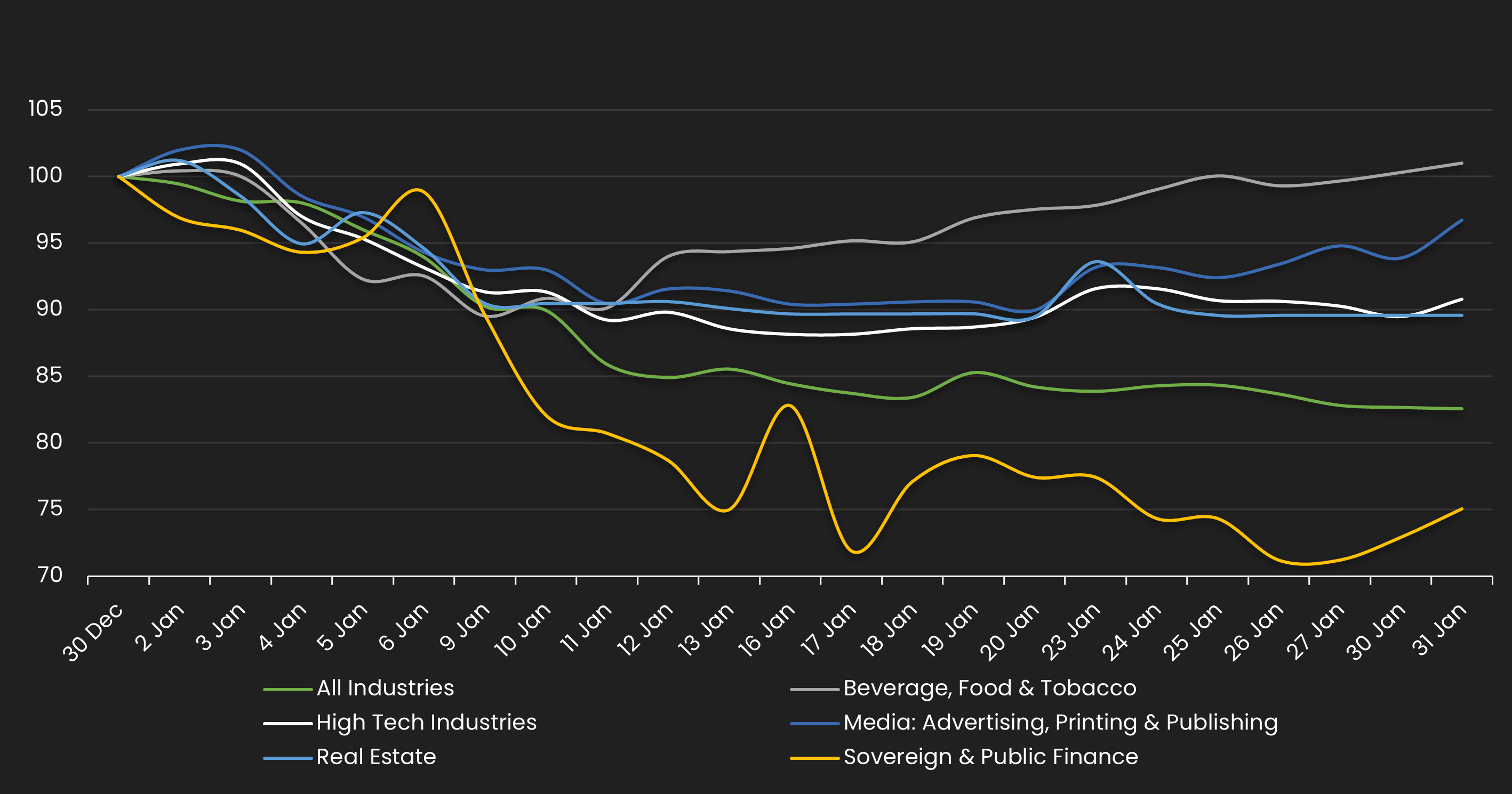 Displays the IG CDS spread by industry between 1/1/23 – 1/31/23 Results are based on 5 select industry sectors, however, we offer data across 36 sectors
