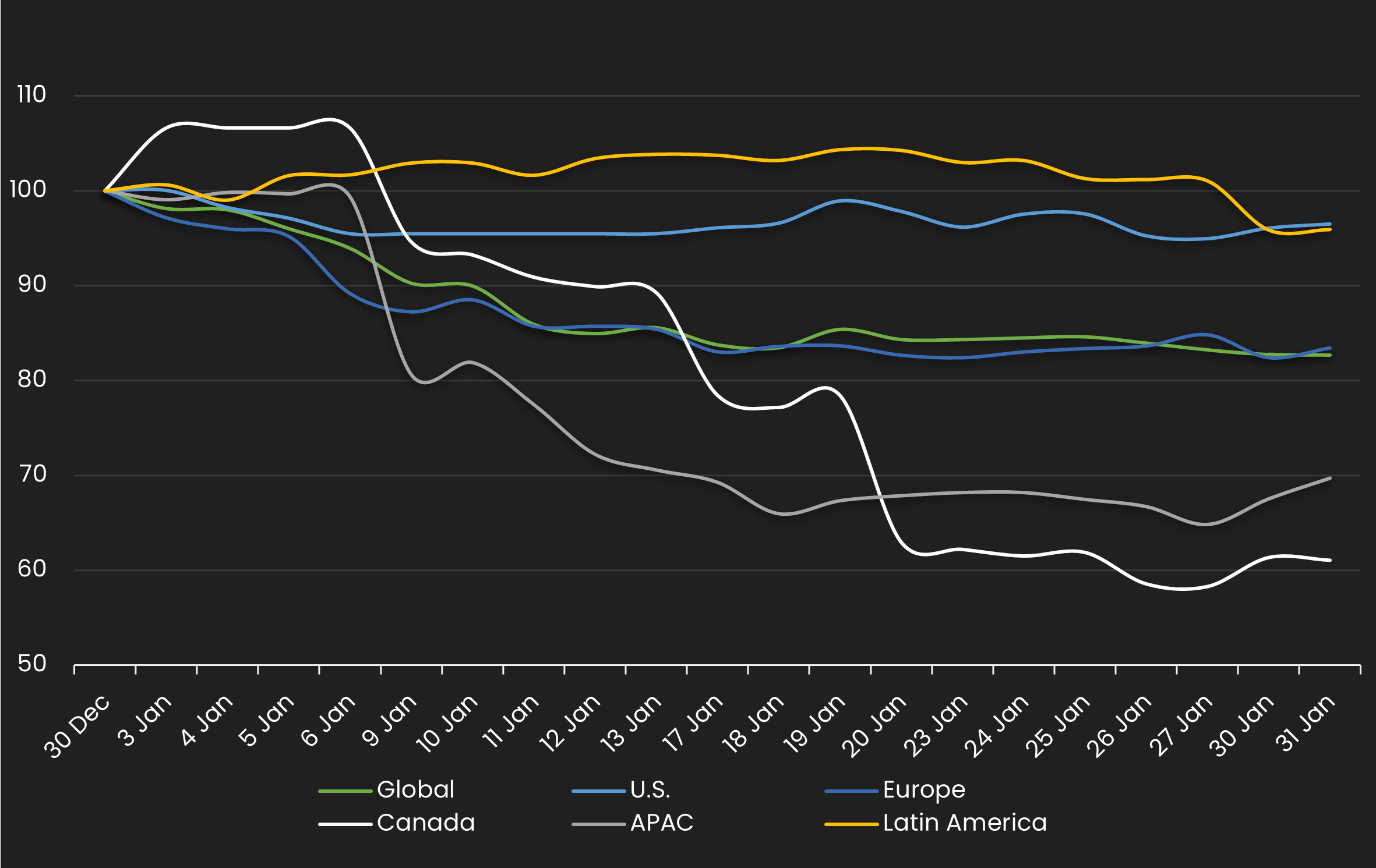 Displays the IG CDS spread by region between 1/1/23 – 1/31/23 Results are based on 5 select regions, however, we offer data across 12 regions