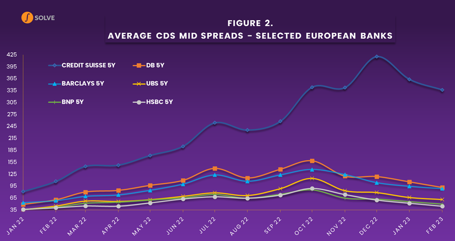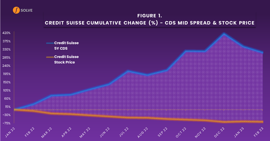 By Luis Miguel Tejada For Switzerland’s Credit Suisse the 2022 calendar year could not have ended any sooner. Headwinds for this banking group were plentiful, highlighted by a sharp credit risk spike and poor stock performance (Figure 1). The first month of 2023 brought some solace for Credit Suisse, with it being the first time over the last twelve months that the mid-spreads for the 5-year Credit Default Swap (CDS) saw a month-over-month reduction (-22%). However, this proved to be just a momentary relief as mid-spreads for Credit Suisse’s 5-year CDS rose back 16% in the two weeks following the end of January.
