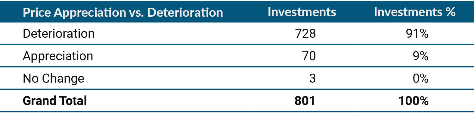 Our analysis covered 346 BDC-held portfolio companies with 801 investments that had pre-trade observable data. The results were notably weaker as of March 31st , 2026: 91% of investments showed price deterioration relative to BDC marks as of December 31, 2026.