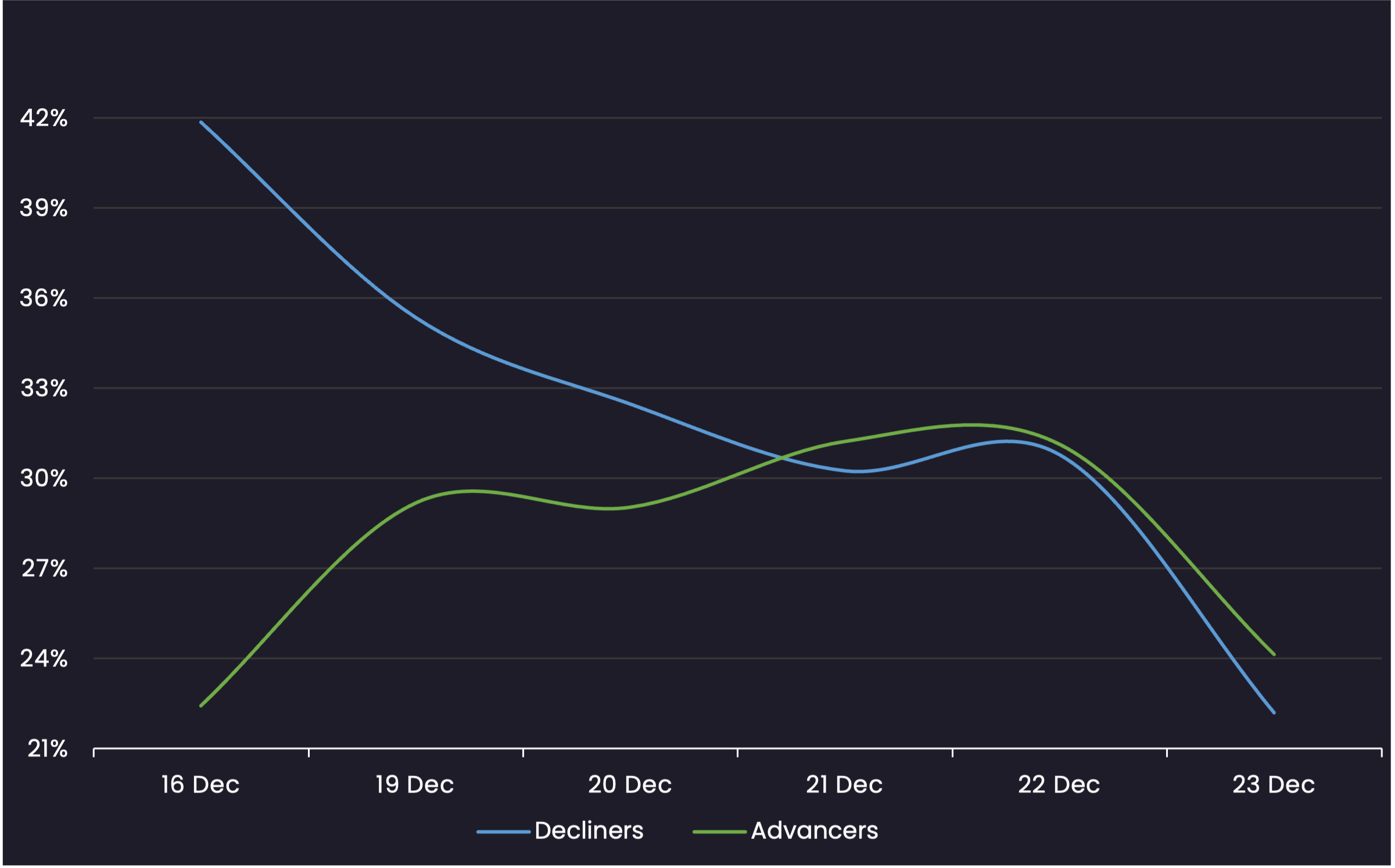 Reveals the percent of loans increasing in price (advancers) vs. loans decreasing in price (decliners) between 12/16/22 – 12/23/22