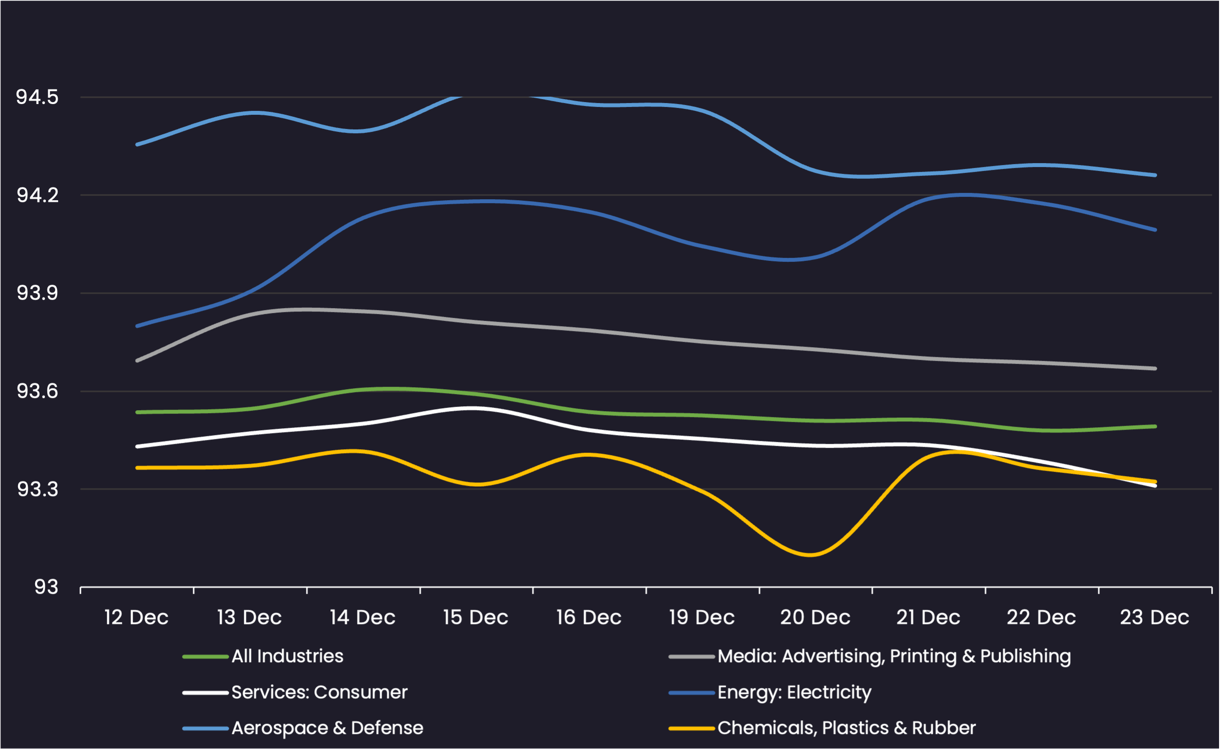 Displays the average loan bid price by sector between 12/16/22 – 12/23/22 Results are based on 5 select industry sectors, however, we offer data across 36 sectors