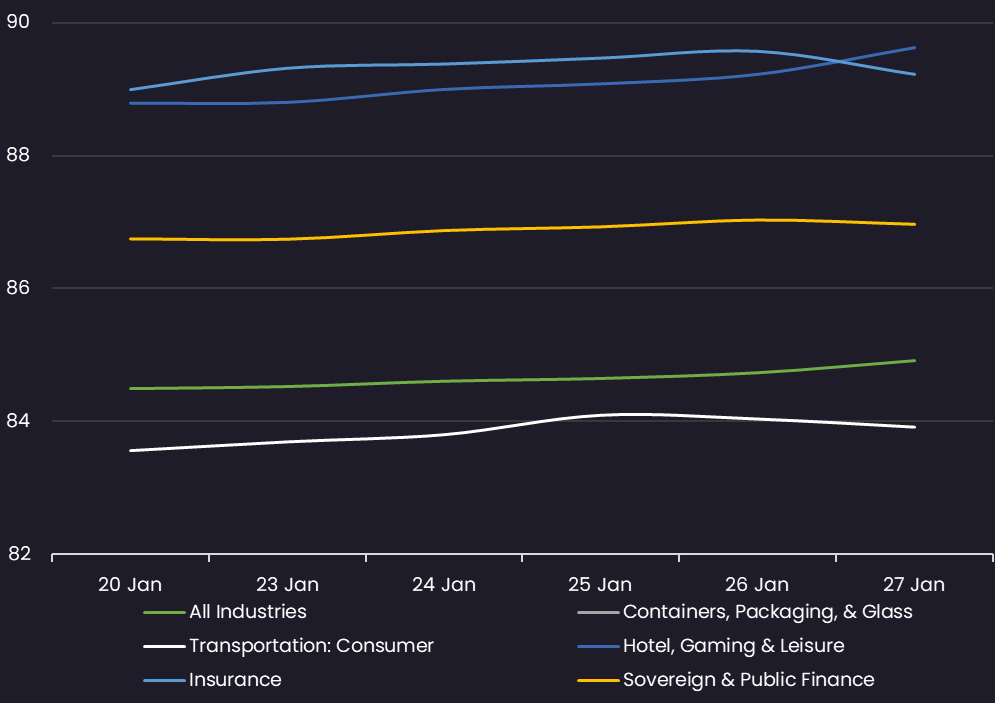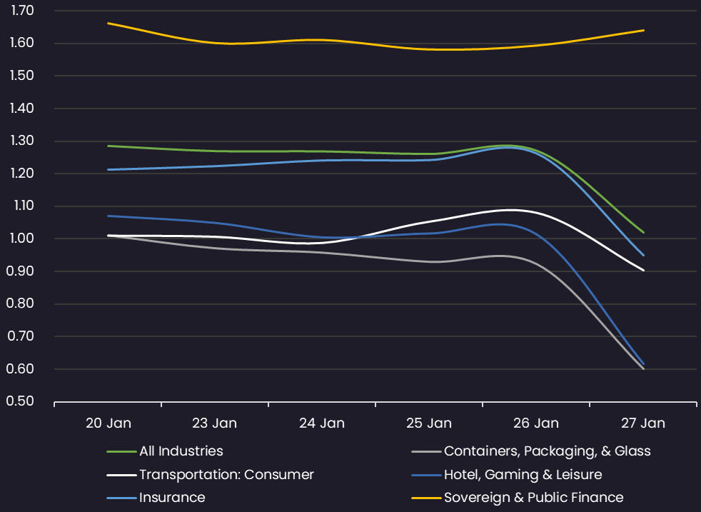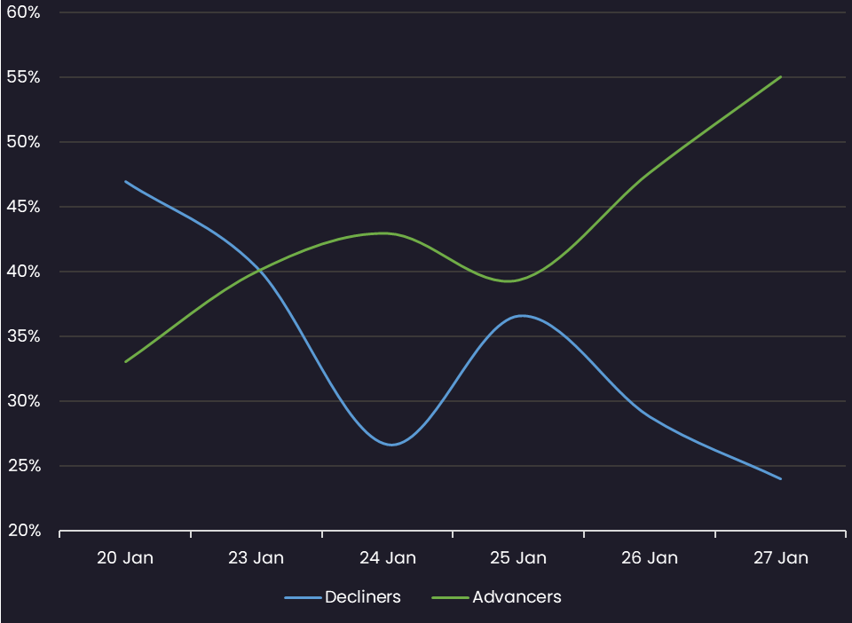 Reveals the percent of HY Corps increasing in price (advancers) vs. HY Corps decreasing in price (decliners) between 1/20/23 – 1/27/23
