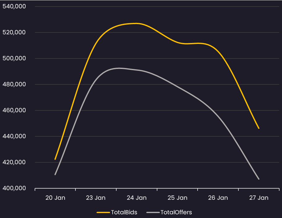 Reveals the total number of quotes by bid and offer between 1/20/23 – 1/27/23