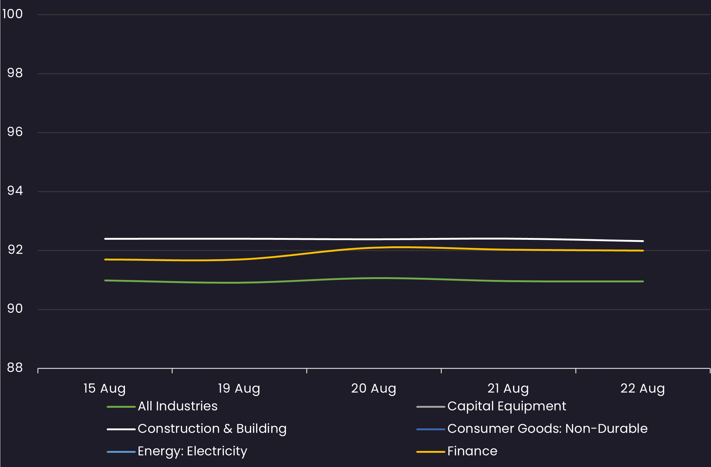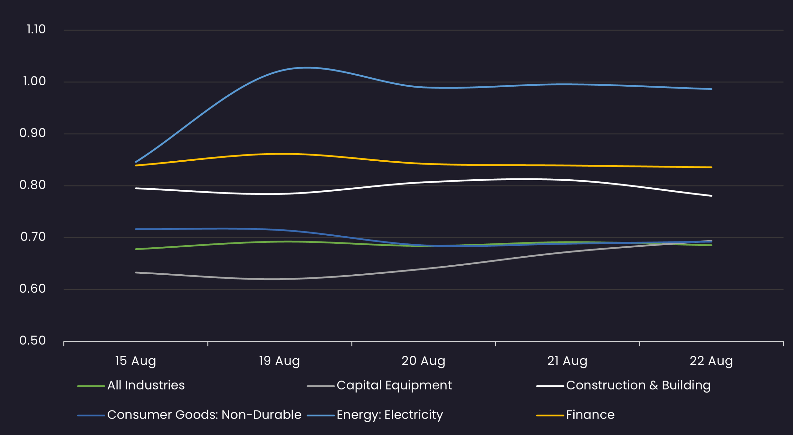 Displays the HY Corp average industry price by sector between 8/15/25 – 8/22/25 Results are based on 5 select industry sectors, however, we offer data across 36 sectors