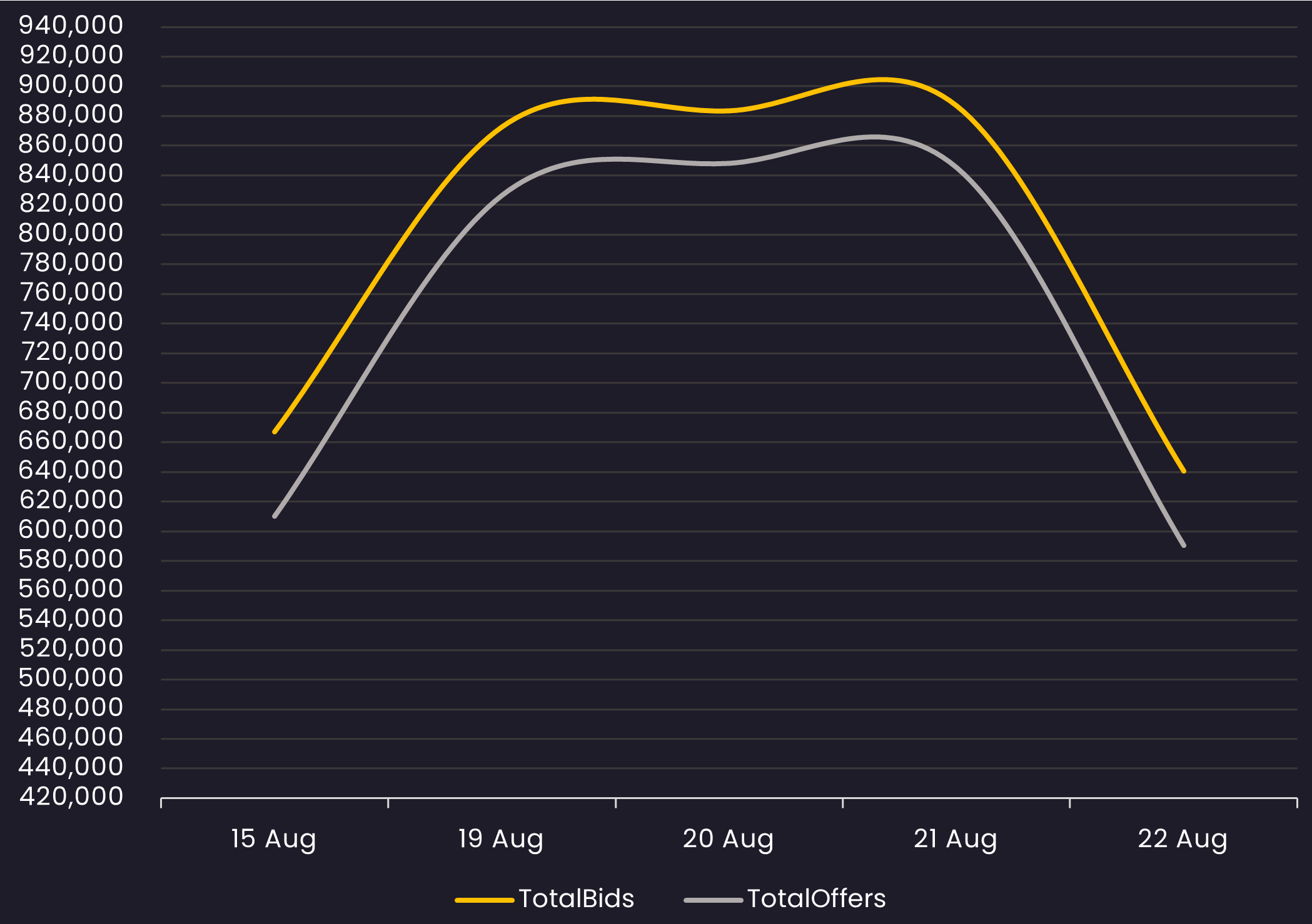 Reveals the total number of quotes by bid and offer between 8/15/25 – 8/22/25