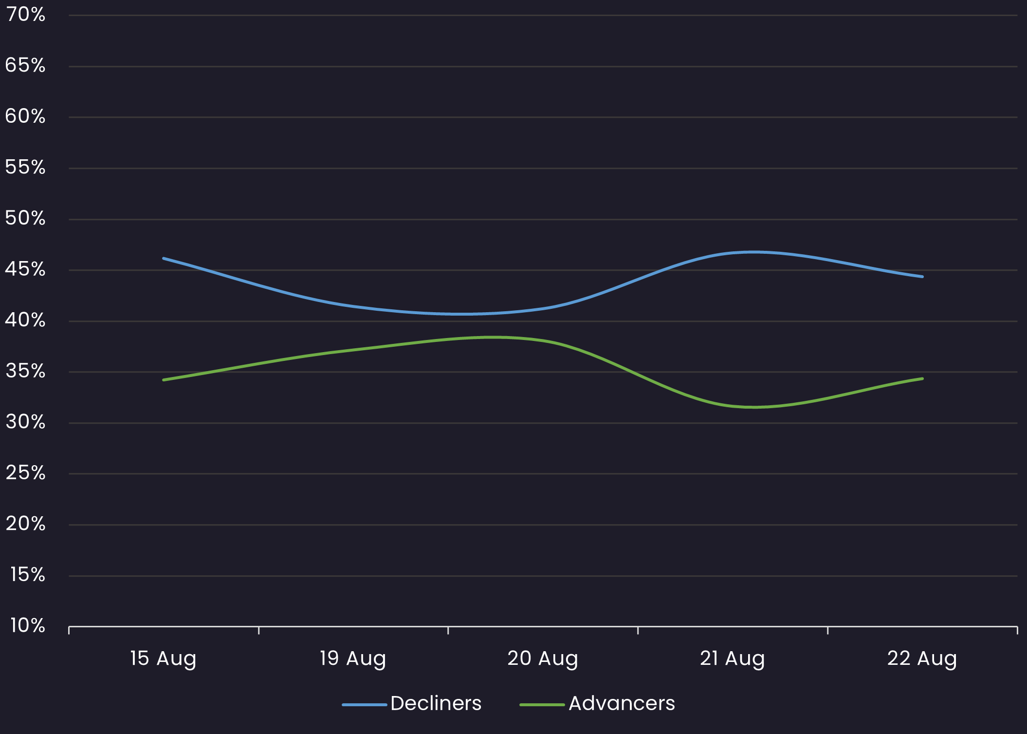 Reveals the percent of HY Corps increasing in price (advancers) vs. HY Corps decreasing in price (decliners) between 8/15/25 – 8/22/25