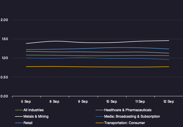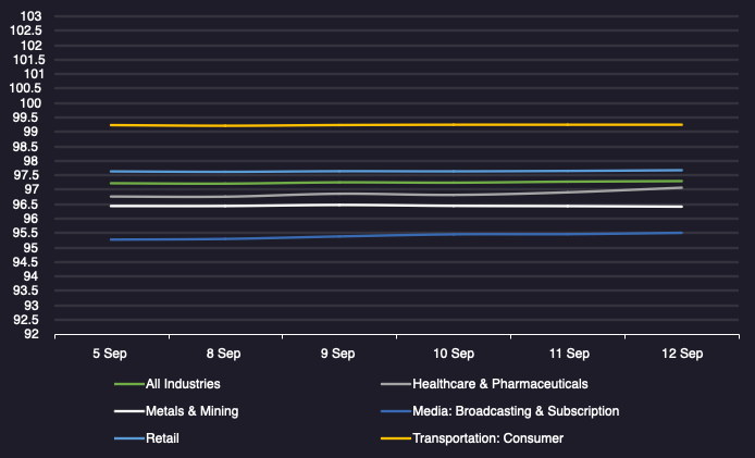 Displays the average loan bid price by sector between 9/5/25-9/12/25 Results are based on 5 select industry sectors, however, we offer data across 36 sectors