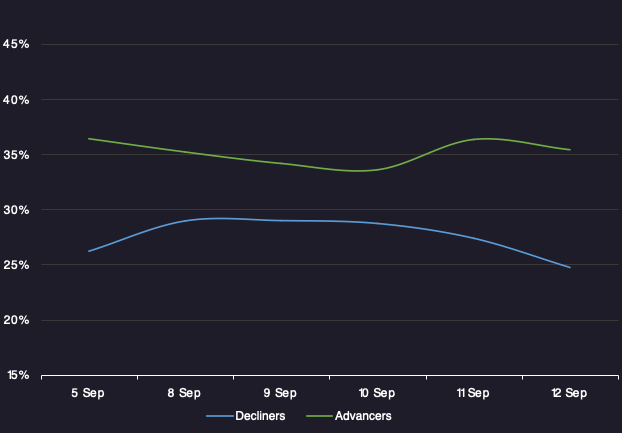 Reveals the percent of loans increasing in price (advancers) vs. loans decreasing in price (decliners) between 9/5/25-9/12/25