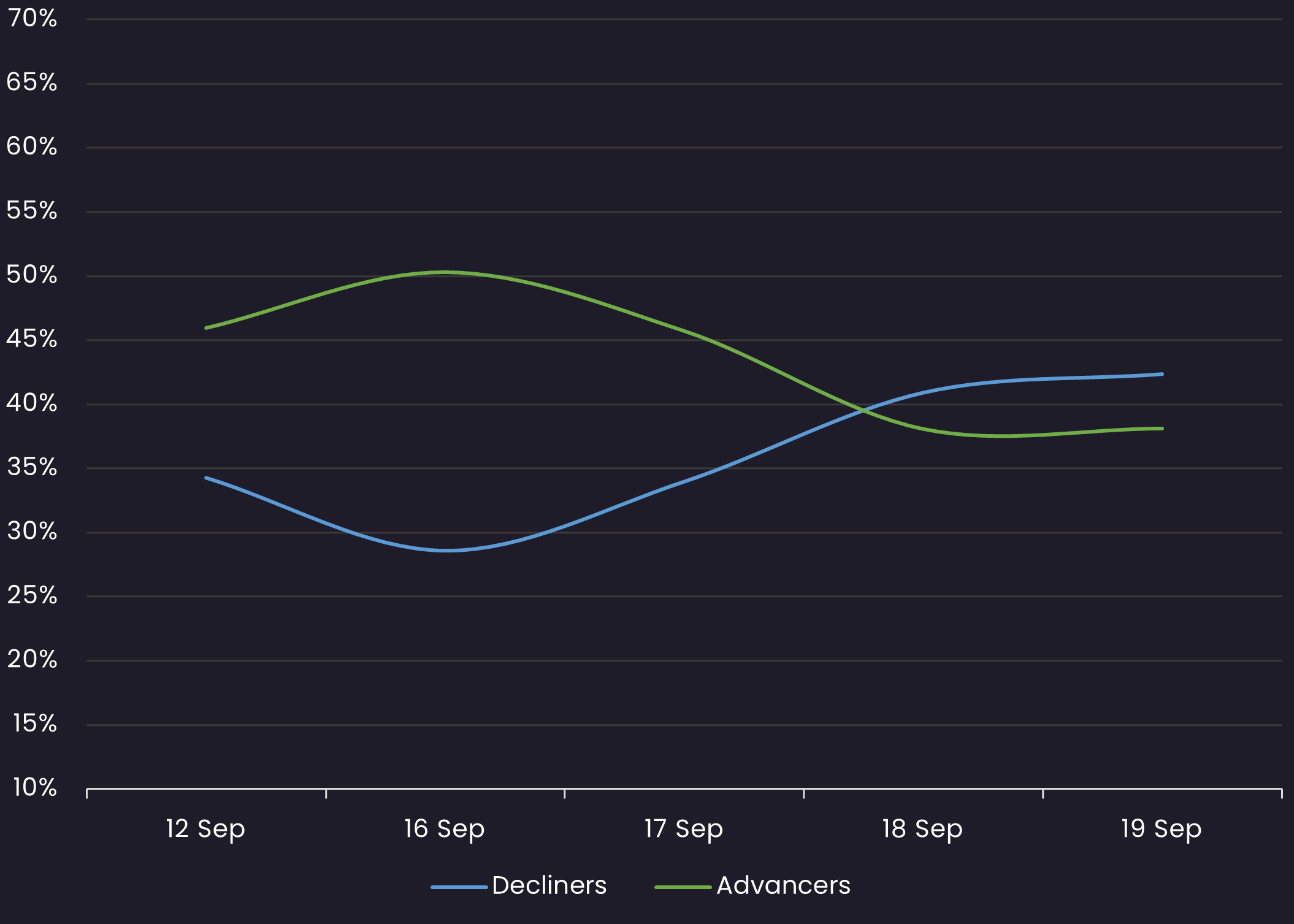 Reveals the percent of HY Corps increasing in price (advancers) vs. HY Corps decreasing in price (decliners) between 9/12/25 – 9/19/25
