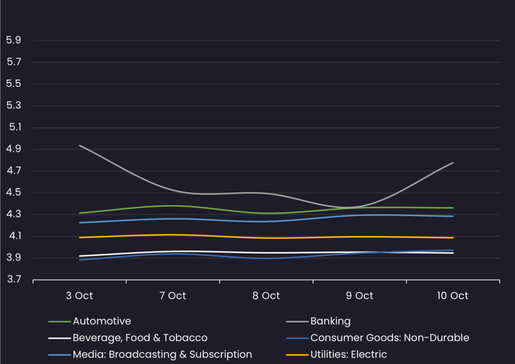 Displays the average IG Corp 5 year yield by industry between 10/3/25 – 10/10/25 Results are based on 5 select industry sectors, however, we offer data across 36 sectors