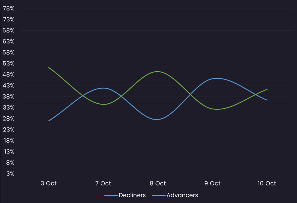 Reveals the percent of IG Corps increasing in price (advancers) vs. IG Corps decreasing in price (decliners) between 10/3/25 – 10/10/25