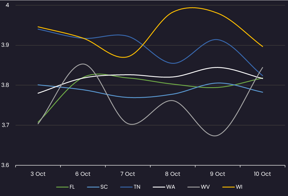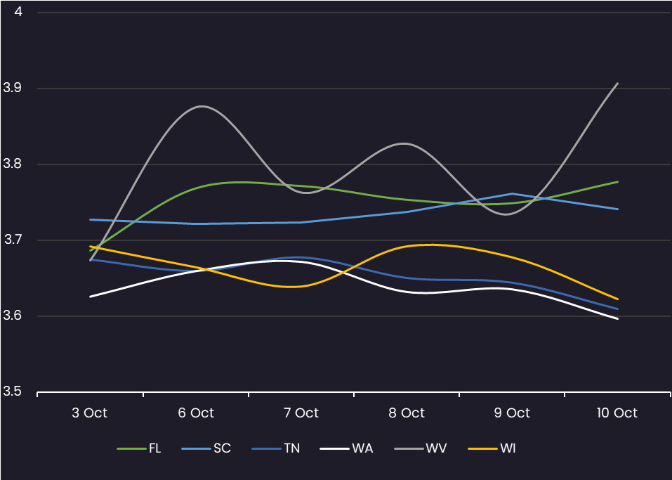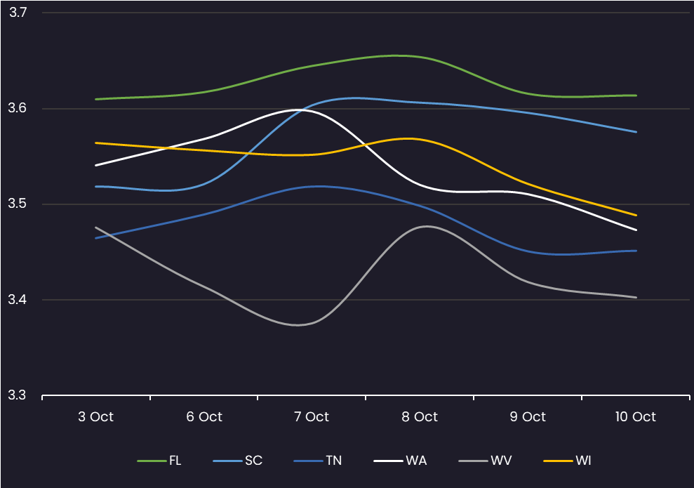 Displays the average Muni 10 year yield by state between 10/3/25-10/10/25 (General Obligation and Revenue Bonds) Results are based on 5 select states, however, we offer data across all 50 states and U.S. territories