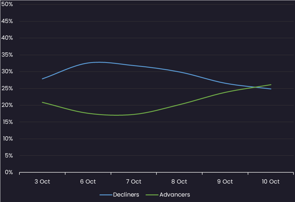Reveals the percent of Muni bonds increasing in price (advancers) vs. decreasing in price (decliners) between 10/3/25-10/10/25