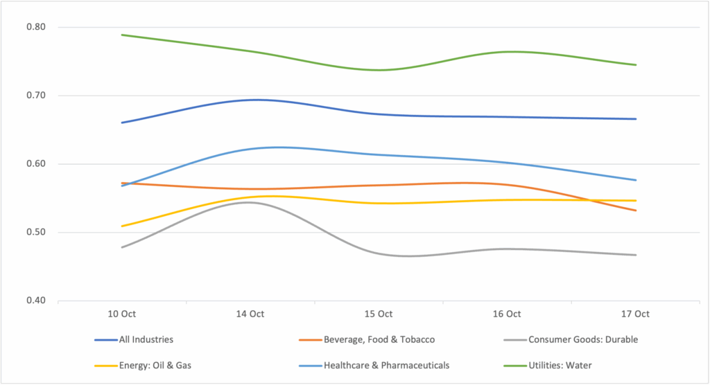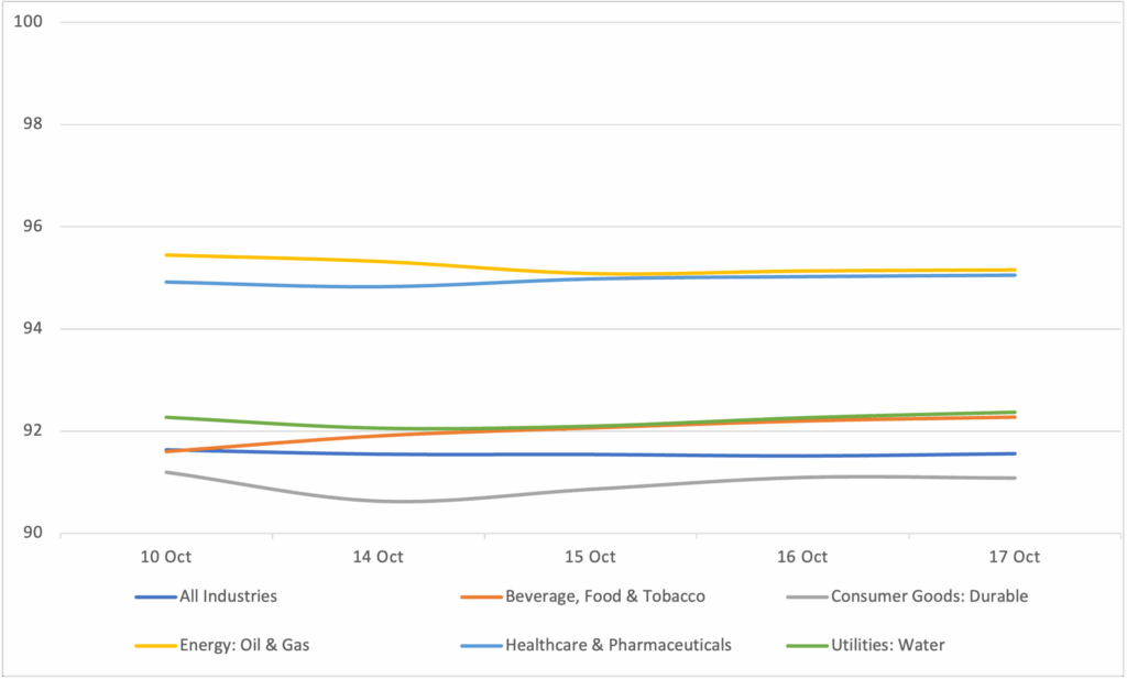 Displays the HY Corp average industry price by sector between 10/10/25 – 10/17/25 Results are based on 5 select industry sectors, however, we offer data across 36 sectors