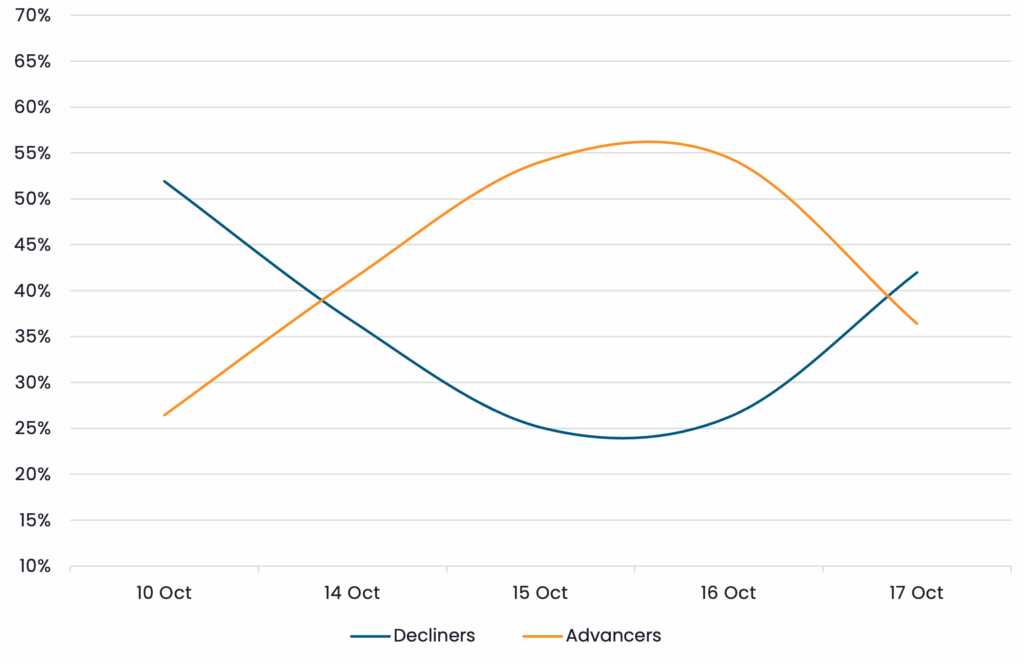 Reveals the percent of HY Corps increasing in price (advancers) vs. HY Corps decreasing in price (decliners) between 10/10/25 – 10/17/25