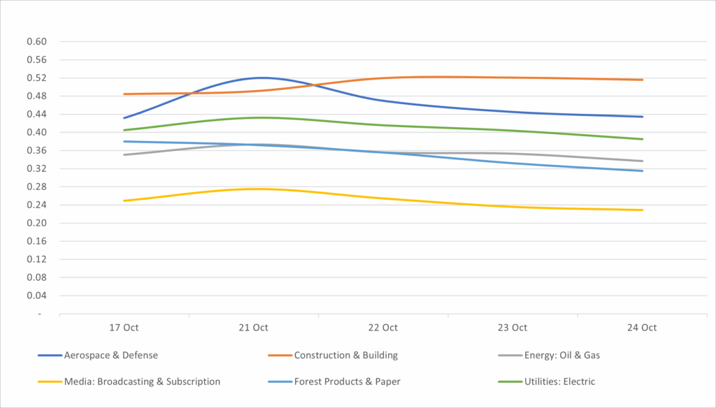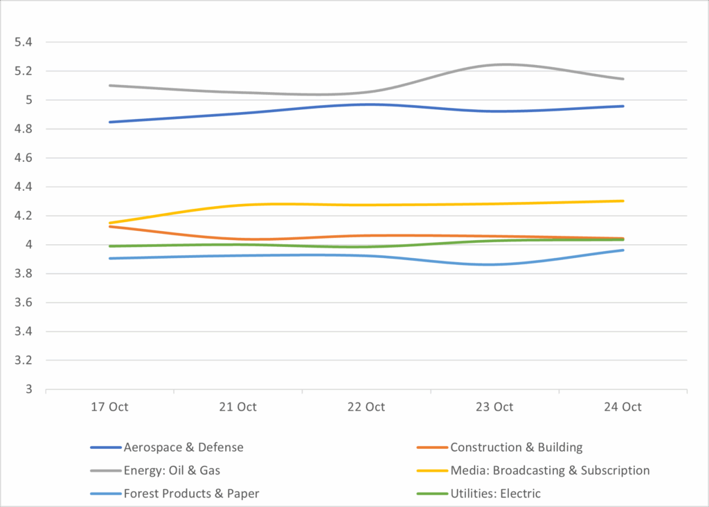 Displays the average IG Corp 5 year yield by industry between 10/17/25 – 10/24/25 Results are based on 5 select industry sectors, however, we offer data across 36 sectors