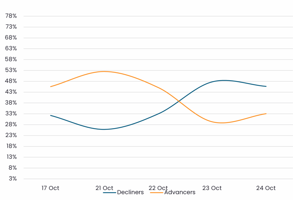 Reveals the percent of IG Corps increasing in price (advancers) vs. IG Corps decreasing in price (decliners) between 10/17/25 – 10/24/25