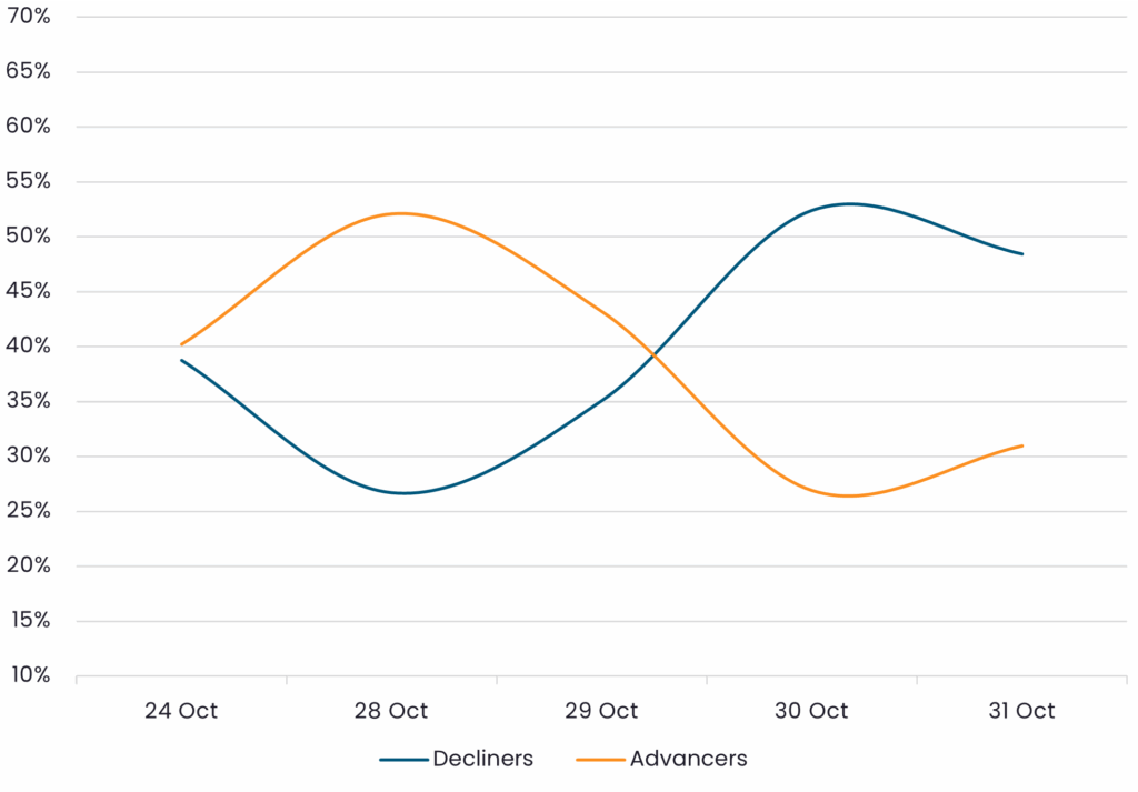 Reveals the percent of HY Corps increasing in price (advancers) vs. HY Corps decreasing in price (decliners) between 10/24/25 – 10/31/25
