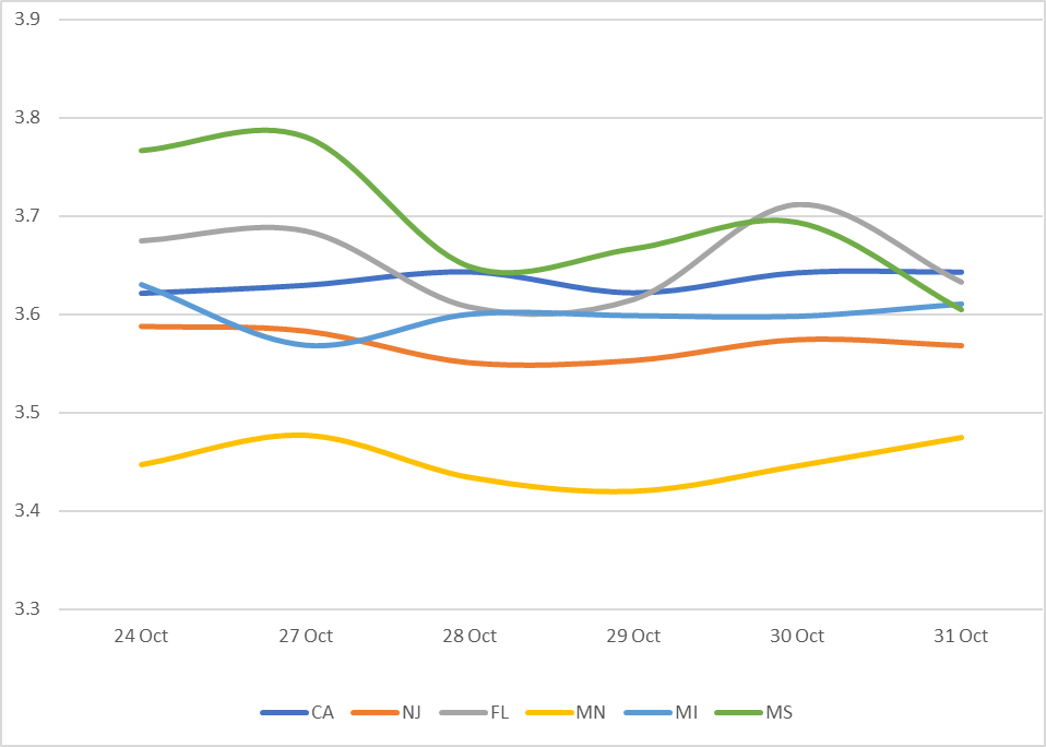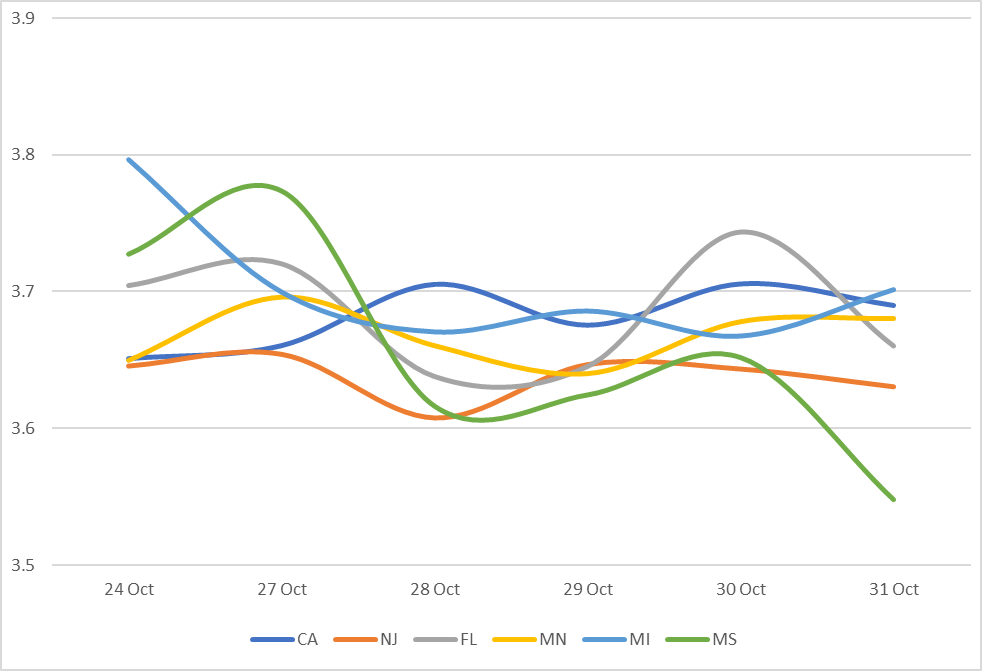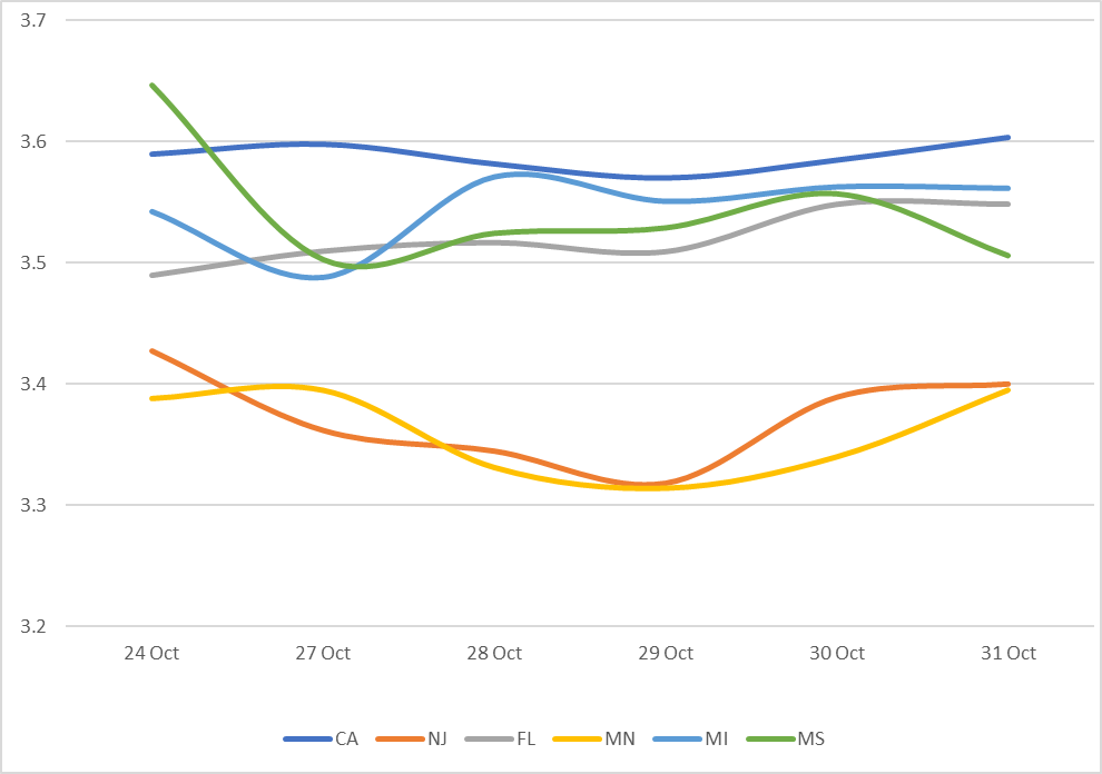 Displays the average Muni 10 year yield by state between 10/24/25-10/31/25 (General Obligation and Revenue Bonds) Results are based on 5 select states, however, we offer data across all 50 states and U.S. territories