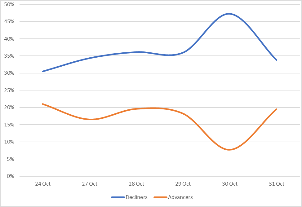 Reveals the percent of Muni bonds increasing in price (advancers) vs. decreasing in price (decliners) between 10/24/25-10/31/25