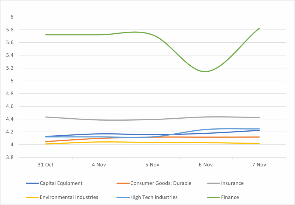 | 10 | Consumer Goods: Non-Durable | ▼ -2 bps | 3.94% | 3.96% |