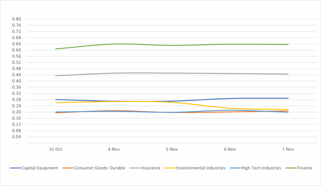 Displays the IG Corp average bid-offer spread by industry between 10/31/25 – 11/7/25 Results are based on 5 select industry sectors, however, we offer data across 36 sectors