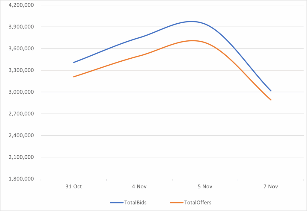 Reveals the total number of quotes by bid and offer between 10/31/25 – 11/7/25