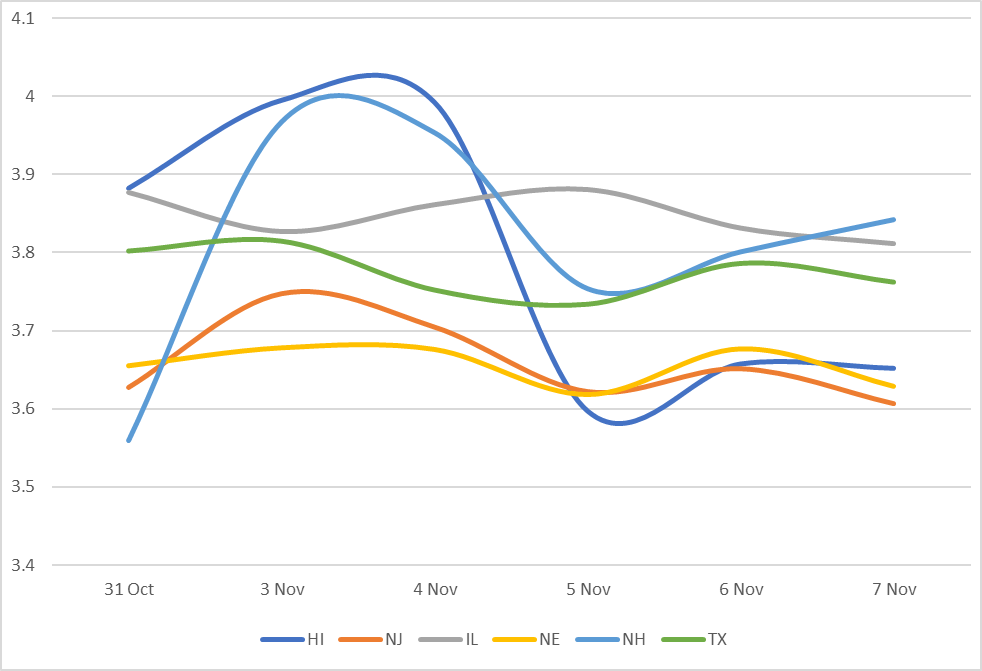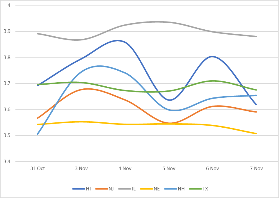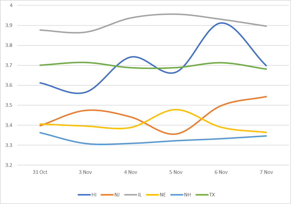 Displays the average Muni 10 year yield by state between 10/31/25-11/7/25 (General Obligation and Revenue Bonds) Results are based on 5 select states, however, we offer data across all 50 states and U.S. territories