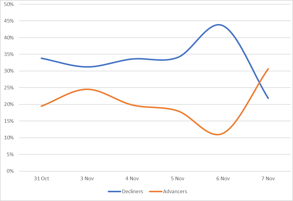 Reveals the percent of Muni bonds increasing in price (advancers) vs. decreasing in price (decliners) between 10/31/25-11/7/25