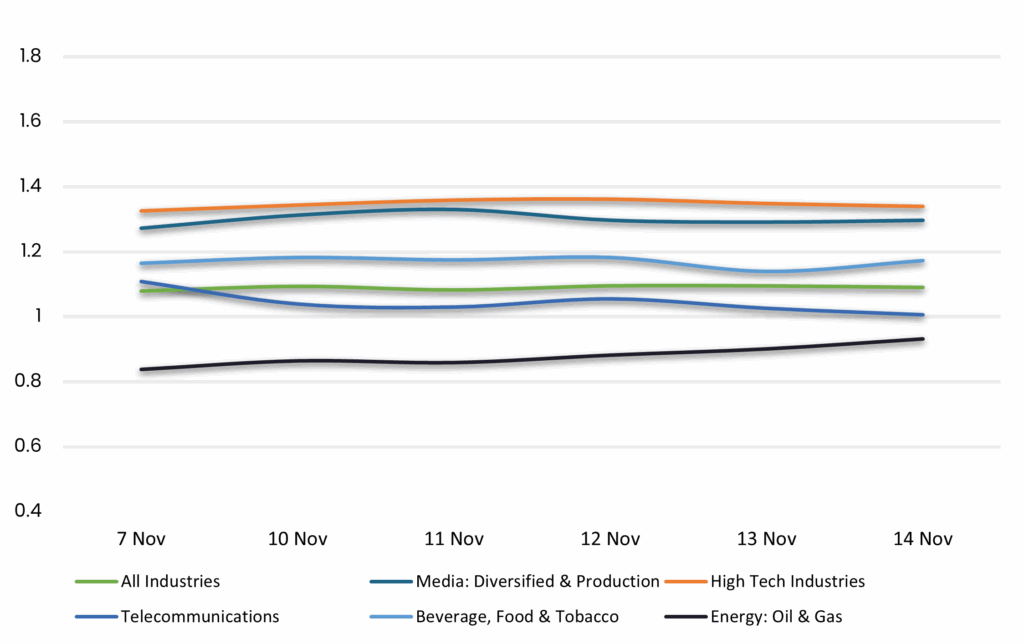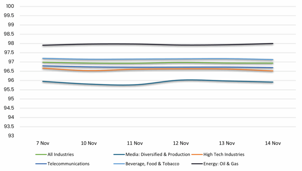 Displays the average loan bid price by sector between 11/7/25-11/14/25 Results are based on 5 select industry sectors, however, we offer data across 36 sectors
