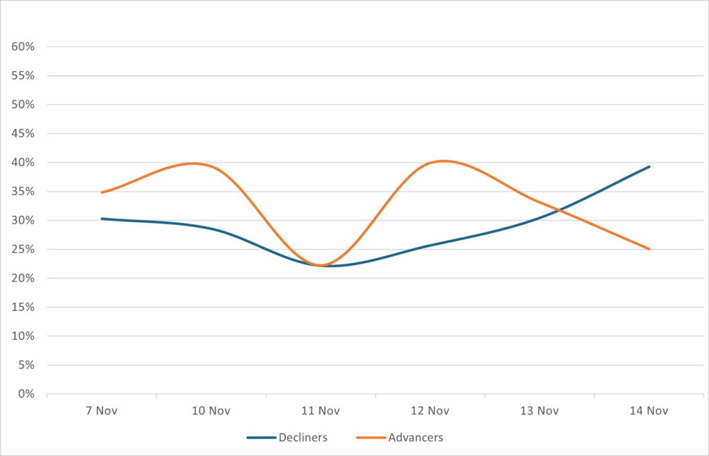 Reveals the percent of loans increasing in price (advancers) vs. loans decreasing in price (decliners) between 11/7/25-11/14/25
