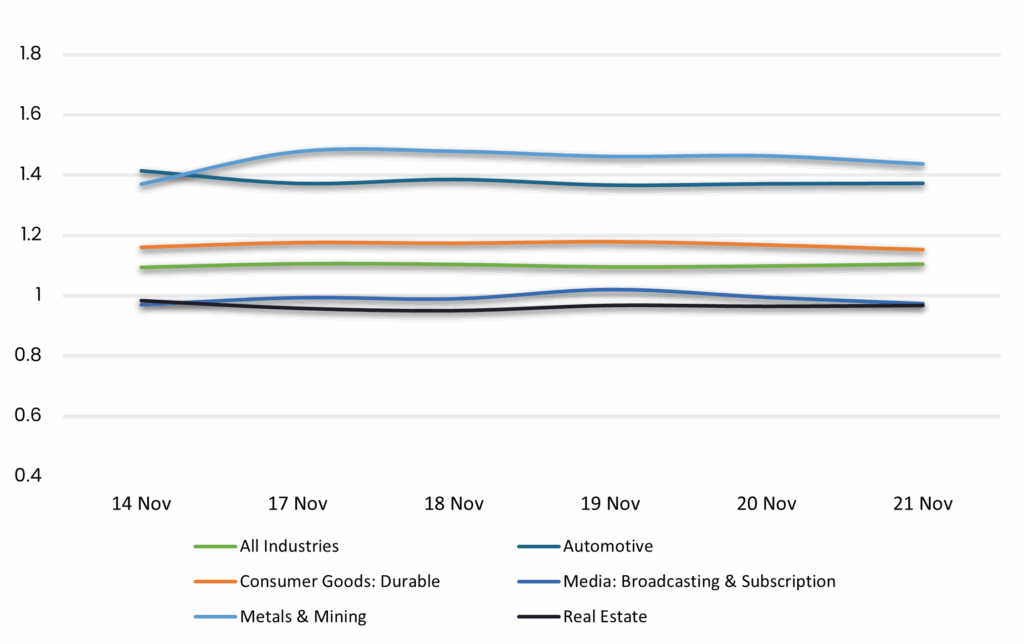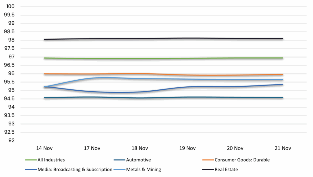Displays the average loan bid price by sector between 11/14/25-11/21/25 Results are based on 5 select industry sectors, however, we offer data across 36 sectors