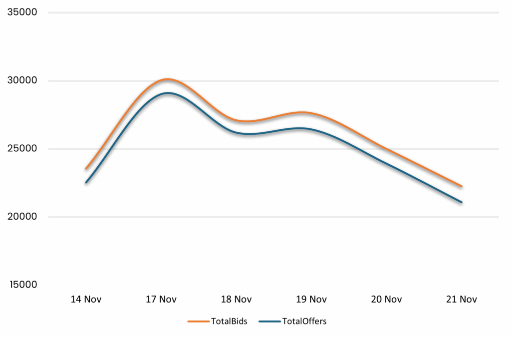 Reveals the total number of quotes by bid and offer between 11/14/25-11/21/25