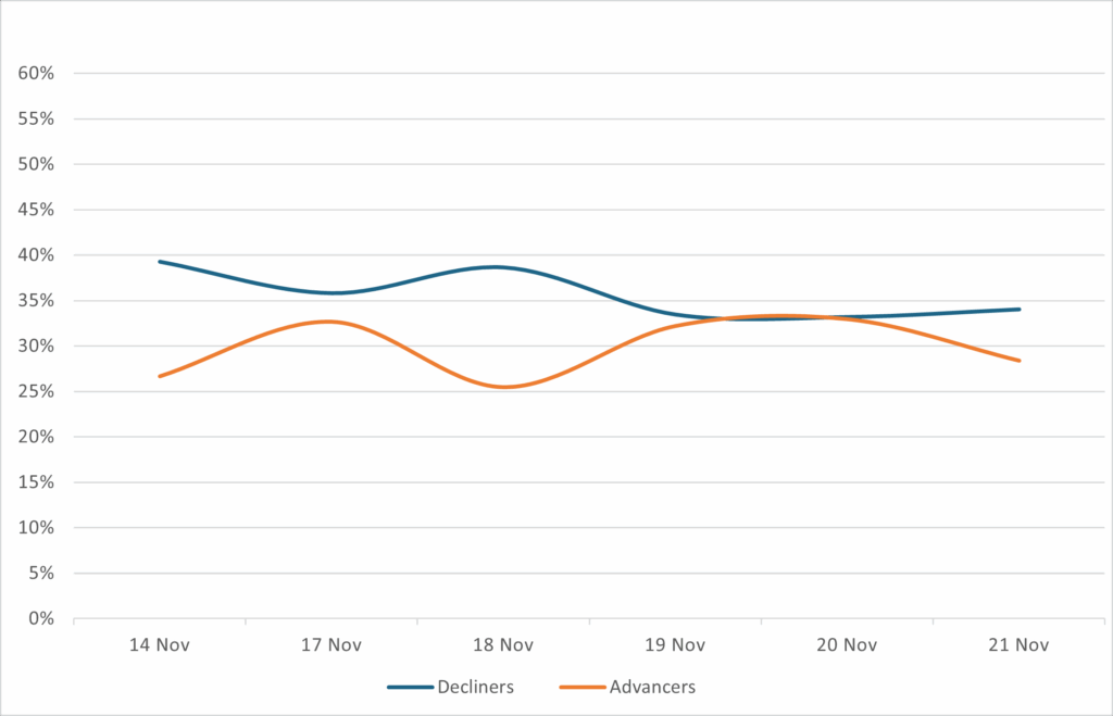 Reveals the percent of loans increasing in price (advancers) vs. loans decreasing in price (decliners) between 11/14/25-11/21/25
