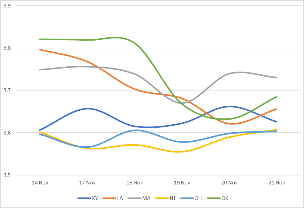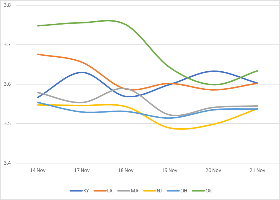 Displays the average Muni 10 year yield by state between 11/14/25-11/21/25 (General Obligation and Revenue Bonds) Results are based on 5 select states, however, we offer data across all 50 states and U.S. territories
