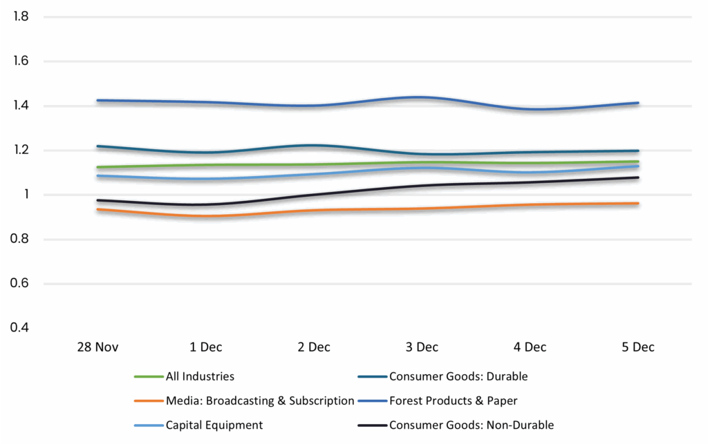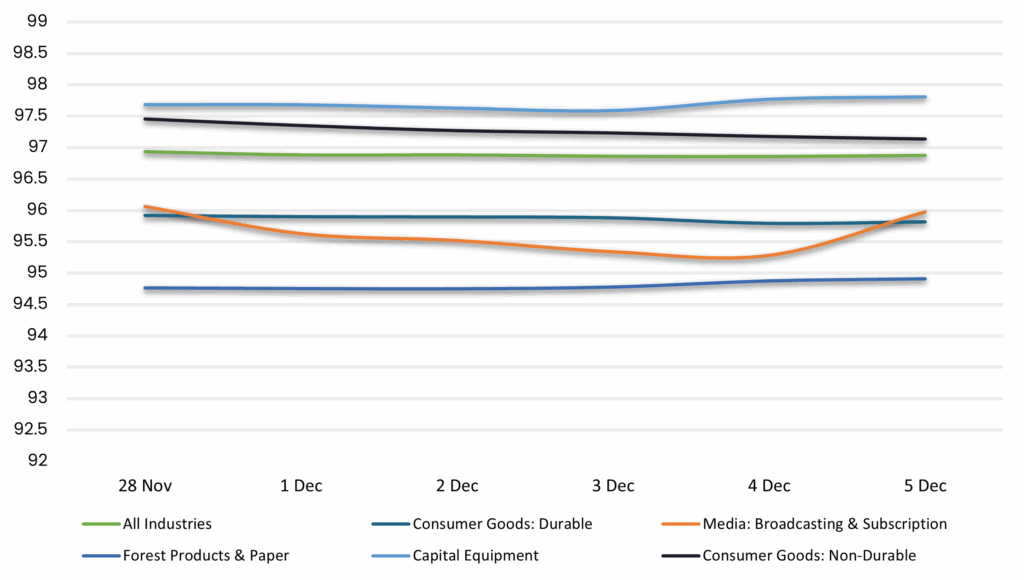 Displays the average loan bid price by sector between 11/28/25-12/5/25 Results are based on 5 select industry sectors, however, we offer data across 36 sectors