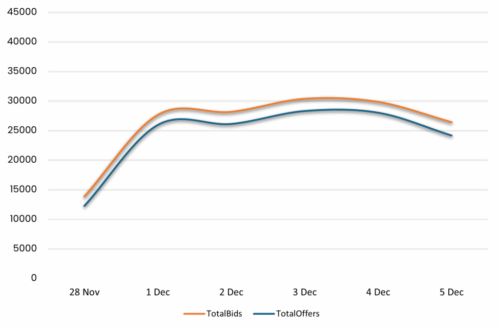 Reveals the total number of quotes by bid and offer between 11/28/25-12/5/25