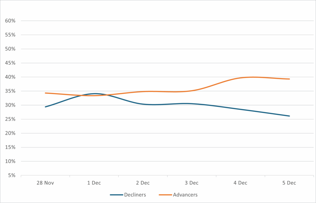Reveals the percent of loans increasing in price (advancers) vs. loans decreasing in price (decliners) between 11/28/25-12/5/25