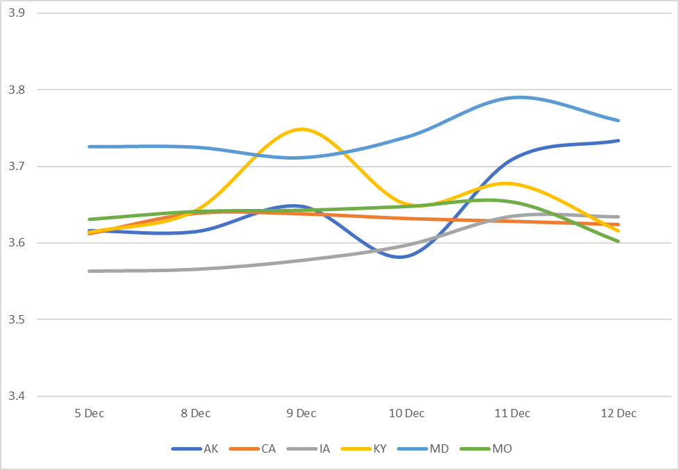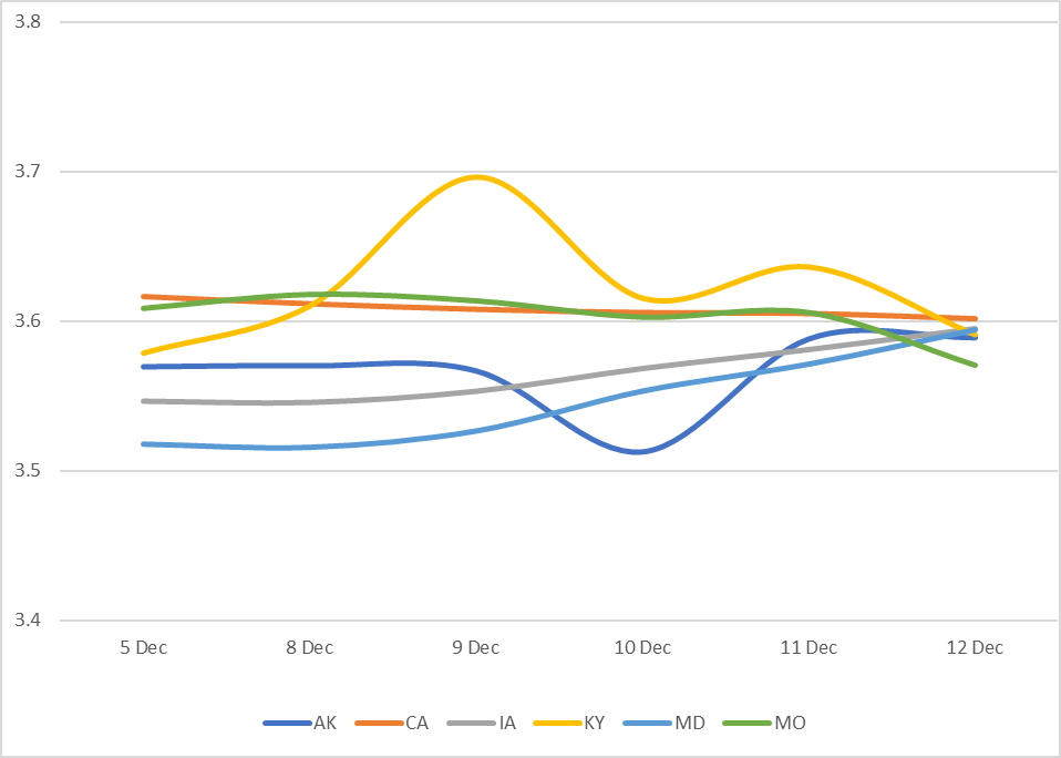 Displays the average Muni 10 year yield by state between 12/5/25-12/12/25 (General Obligation and Revenue Bonds) Results are based on 5 select states, however, we offer data across all 50 states and U.S. territories