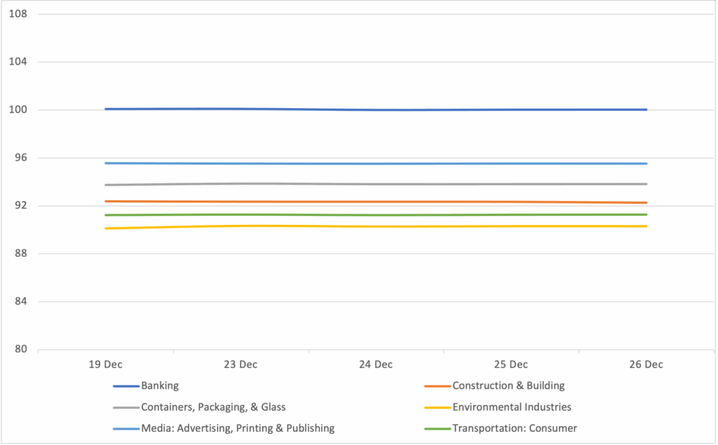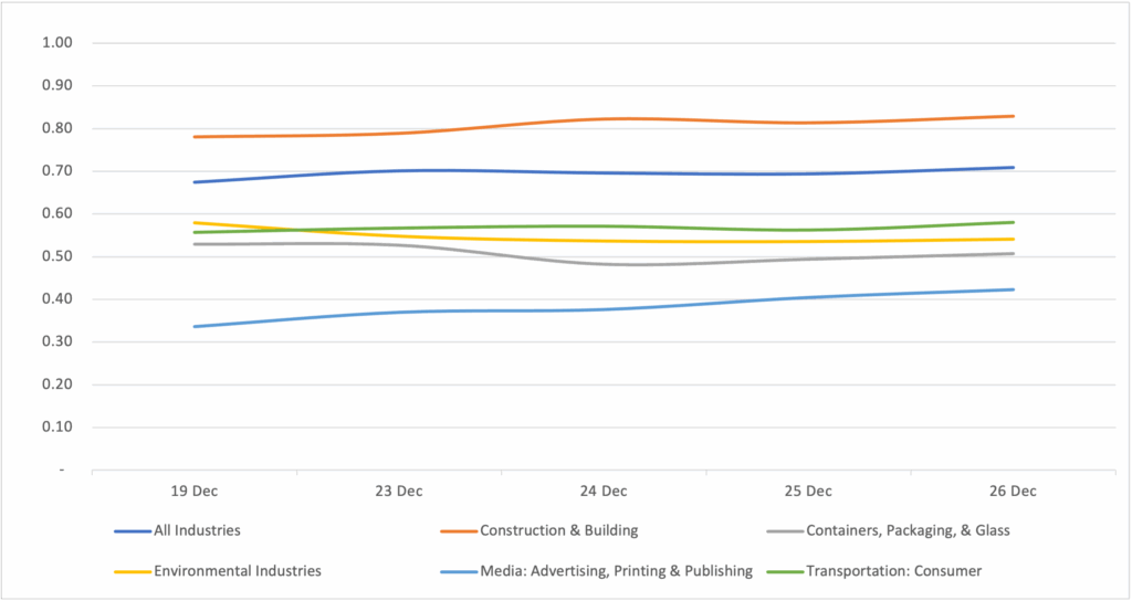 Displays the HY Corp average industry price by sector between 12/19/25 – 12/26/25. Results are based on select industry sectors, however, we offer data across 36 sectors.