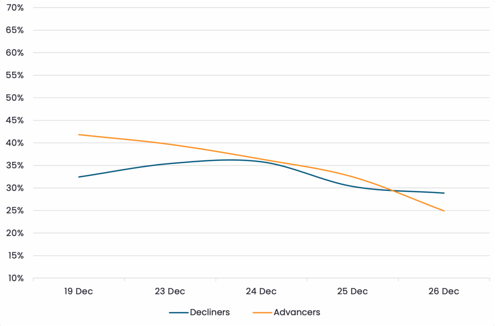 Reveals the percent of HY Corps increasing in price (advancers) vs. HY Corps decreasing in price (decliners) between 12/19/25 – 12/26/25