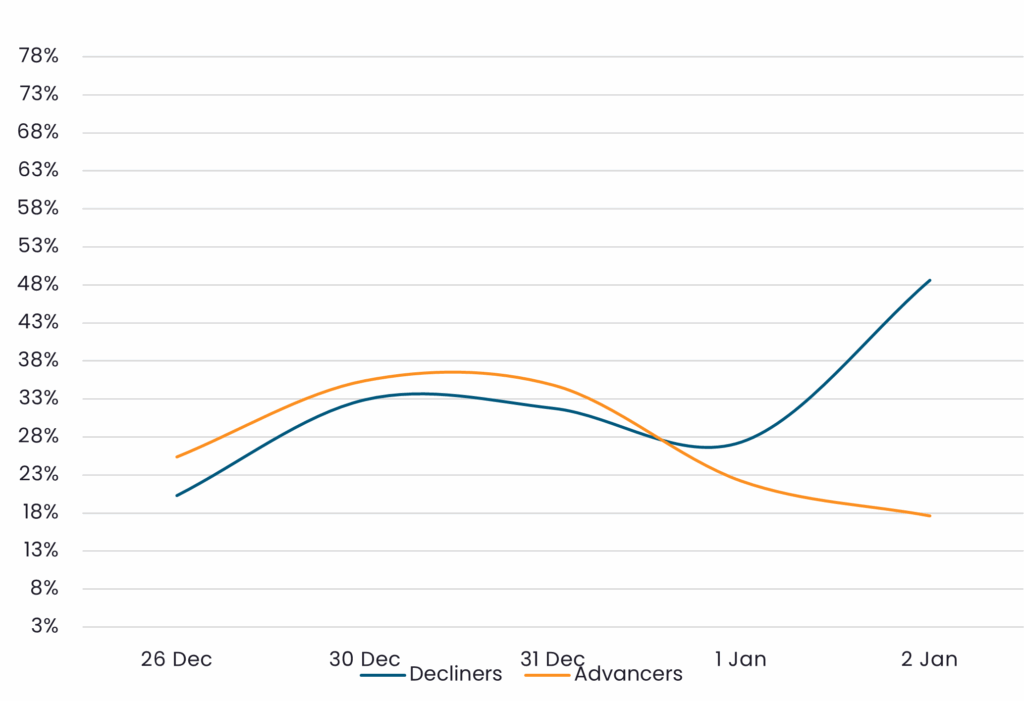 Reveals the percent of IG Corps increasing in price (advancers) vs. IG Corps decreasing in price (decliners) between 12/26/25 – 1/2/26