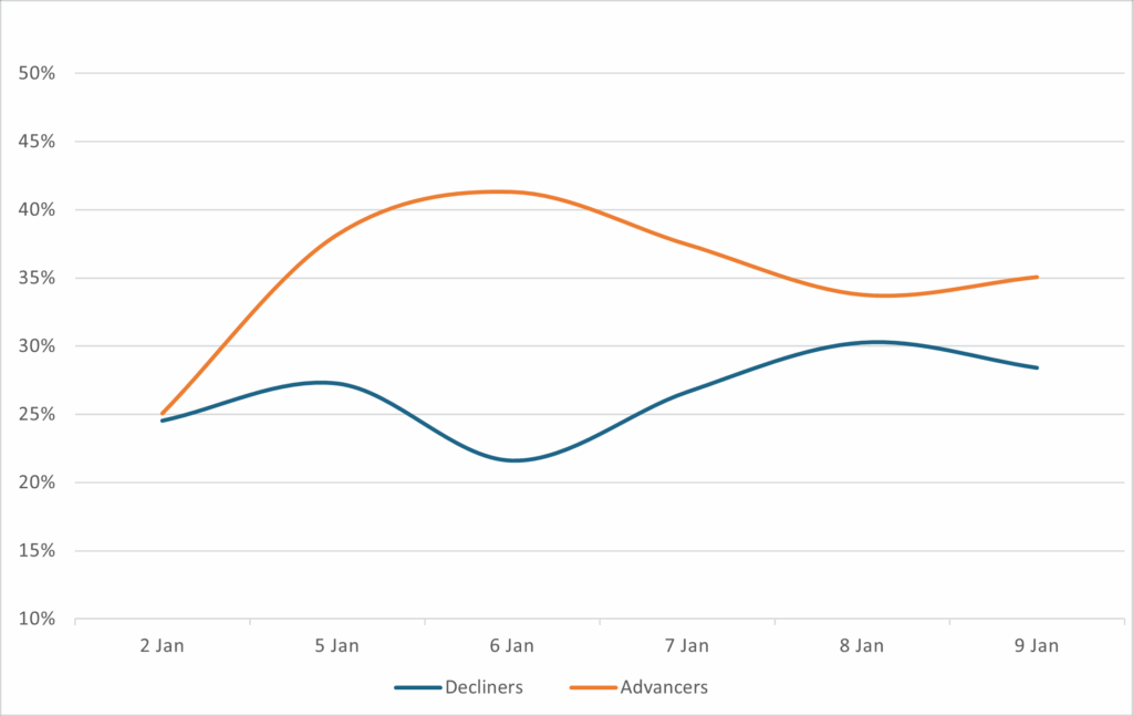 Reveals the percent of loans increasing in price (advancers) vs. loans decreasing in price (decliners) between 1/2/26-1/9/26